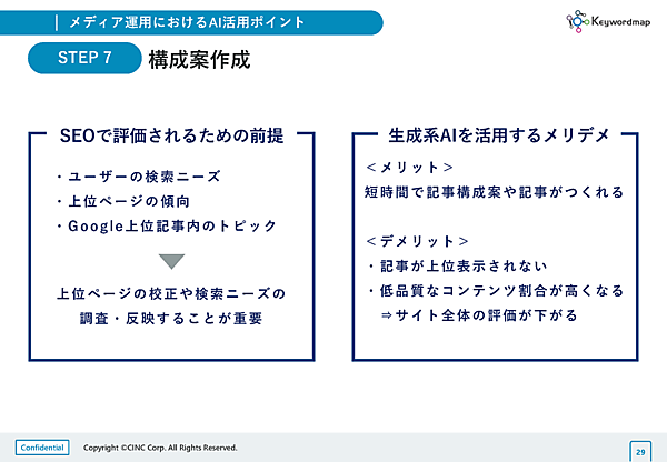 生成AIを活用すれば、短時間で記事構成案や記事が作れるというメリットがあるが、現状、生成AIが作ったコンテンツをそのまま掲載するのはお勧めできない。低品質なコンテンツの割合が高くなり、サイト全体の評価が下がるリスクがあるからだ。「人間の目で校正・校閲したり、言い回しを変えたりと、手抜きせずにやるべきです」と仲野氏は忠告する。