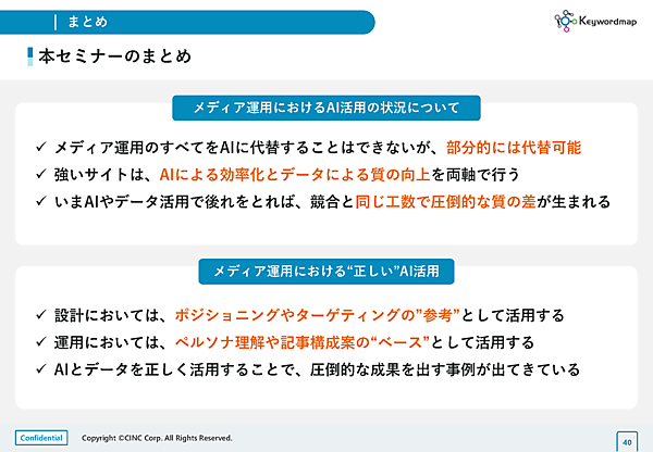 仲野氏は最後に、「生成AIがオウンドメディア運用の大部分を担えるようになってきたいま、競合他社が、同じ工数でもAIを上手く活用して、より高品質なページを作ったり、効率化で生まれた時間を別の業務に充てたりする可能性は十分あります。遅れを取らないためにも、可能な範囲からAI導入を始めるべきではないでしょうか」と述べ、セッションを締めくくった。