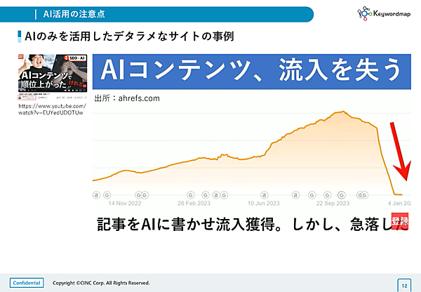 一方で、「コンテンツを活用するプロセスには注意すべきだ」と仲野氏は指摘する。過去に、生成AIによって商品レビュー記事を大量に作り、SEOの順位を数か月で大幅に上げたという事例があった。しかし、後にGoogle側で対策がなされたとみられ、検索順位は急落してしまったという。