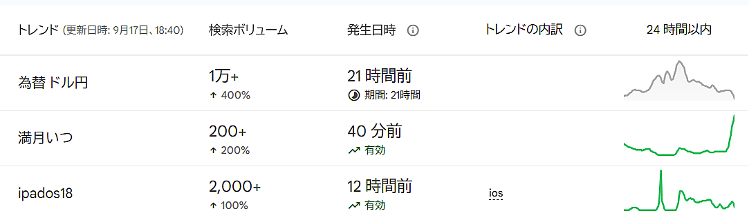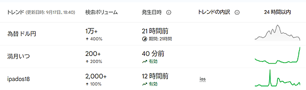 表の各行は、トレンドになっている検索用語を表しています。ここでは、実際のGoogle検索のおおよその数を示す「検索ボリューム」が表示されます。これは、以前のエピソードで説明した検索関心度指標とは異なります。