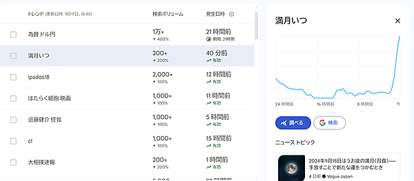 検索用語をクリックすると、トレンドの内訳やそのトレンドに関連するニュース記事など、トレンドに関する詳細が表示されます。