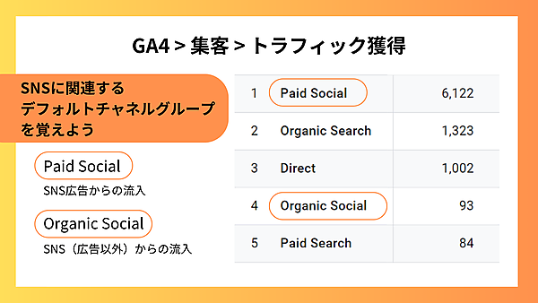 (3)「Organic Social」や「Paid Social」のユーザー数を確認します。