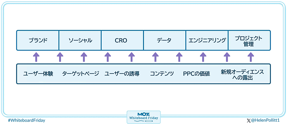 次に、CRO(コンバージョン率の最適化)だ。私たちは適切なトラフィックを適切なページに送り込むことに大きな重点を置いているため、CROチームには常に影響を及ぼすことになる。コンバージョン率のために最適化を試みるCROチームの仕事はまさに私たちがやっていることだ ―― 具体的には「適切なユーザーをウェブサイトに呼び込み、ウェブサイト内を自由に移動して最終的な目的を達成してもらえる」ように取り組むことだ。