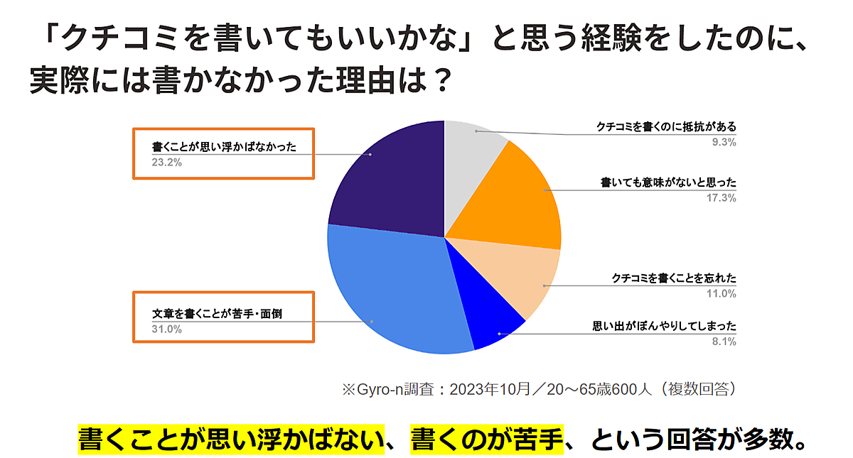 その一方で、店舗側は「なかなかクチコミが増えない」と頭を悩ませているのが実情だ。同調査によると、ユーザーがクチコミを書かない理由は「文章を書くことが苦手・面倒」が31.0%で最も多く、「書くことが思い浮かばなかった」が23.2%だった。