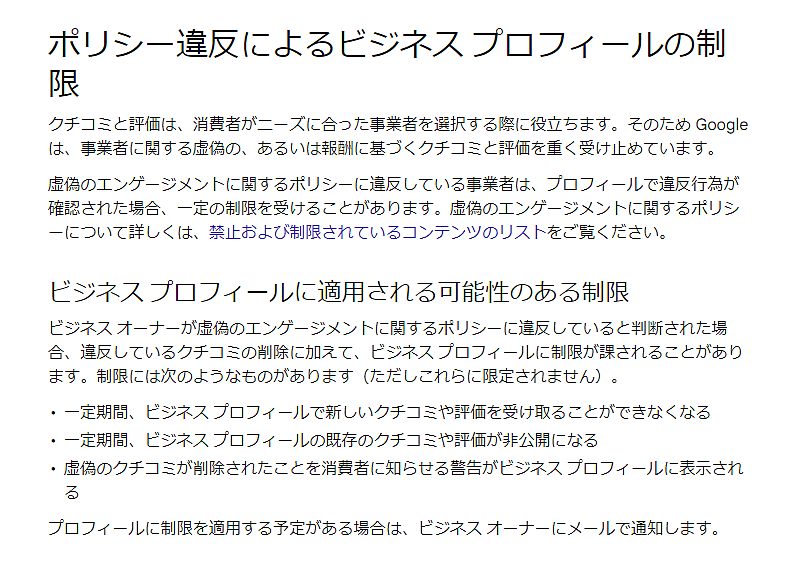 規約に違反すると、アカウント停止やビジネスの公開停止などのペナルティーが課されることがある。なお、2024年9月14日にはGoogleのヘルプが改訂され、「ポリシー違反によるビジネス プロフィールの制限」のページが公開された。違反行為に対して具体的な措置をとることが示され、取り締まりはよりいっそう厳しくなっている。
