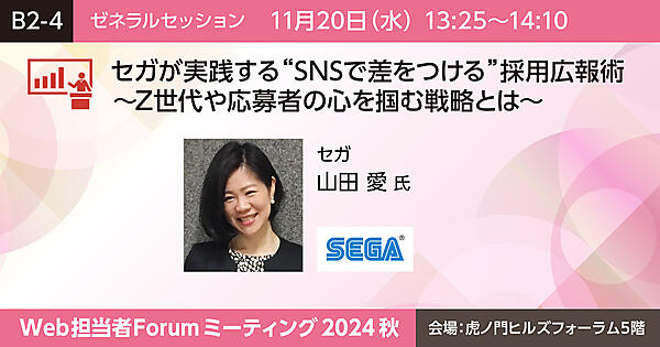 セガではSNS(XやLinkedInなど)を採用広報に活用し、社員の服装や社内のリアルな様子を発信しています。本講演では、Z世代の新卒やキャリア採用を目的としたSNS活用術を解説。応募者に「伝える」投稿ではなく、「伝わる」投稿にする工夫も紹介します。