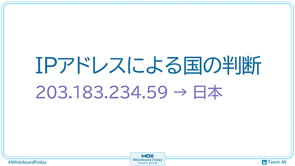 そこで、もっとテクニカルな別の方法として、IPアドレスによる国の判断を使えるかもしれない。これが何をするものかと言えば、君のウェブサイトにアクセスしたユーザーのIPアドレスをもとに、そのユーザーがどの国にいるかを判断するというものだ。