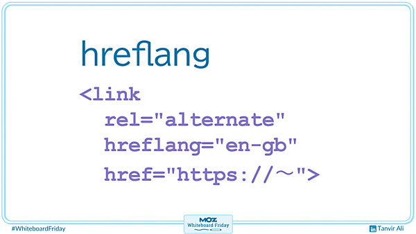 そして最後に、hreflangだ。おそらく僕たちの誰もがよく知っていて、耳にするだけで尻込みしてしまう方法だろう。SEOの観点からは、見ての通り、とても単純だ。ただのHTMLタグにすぎない。グーグルに対し、次のことを伝えるものだ:
