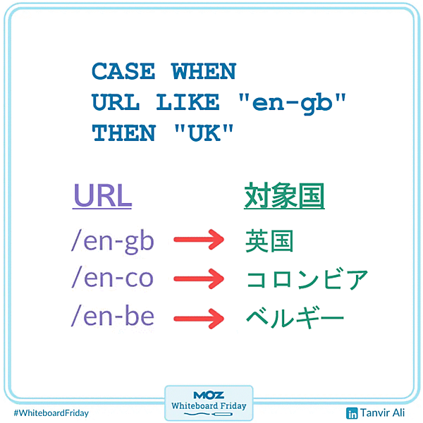 BigQuery内にあるURL列の値に"en-gb"が含まれる(LIKE)場合は(WHEN)、そのURLを"UK"対象のデータとして分類する。