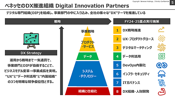 ベネッセでは、社内のデジタル専門組織「Digital Innovation Partners(DIP)」を中心に、これらのDX推進に尽力してきた。DIPのメンバーは、事業戦略からUI/UX開発、PDM支援、データ利活用、デジタルマーケティング、システム開発まで、さまざまな事業部門に入り込み、DXの課題解決の支援にあたってきた。