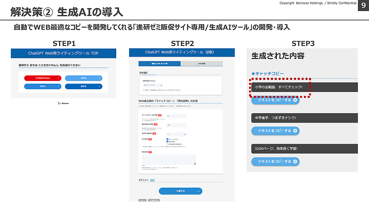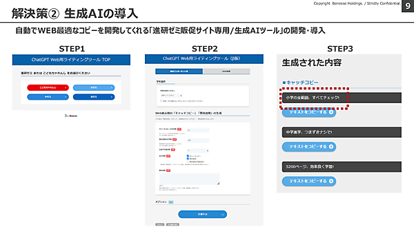 また、Studioの導入にあわせて、生成AIを活用した「進研ゼミ販促サイト専用コピー生成ツール」も内製開発した。これは、紙のダイレクトメール用に作成された長めのコピーを、Webに適した文字数や表現に変換するツールで、これによって、Web制作の経験に乏しくても、誰でもWebの特性にマッチした適切なコピーが作成できるようになった。