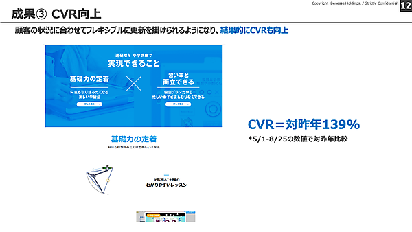 進研ゼミ小学講座において、2024年5月1日~8月25日の期間で昨年と比較したところ、コンバージョン率(CVR)が139%向上していた。Studioと生成AIを導入した今回のプロジェクトによって、マーケティング面も強化されたことがわかる。