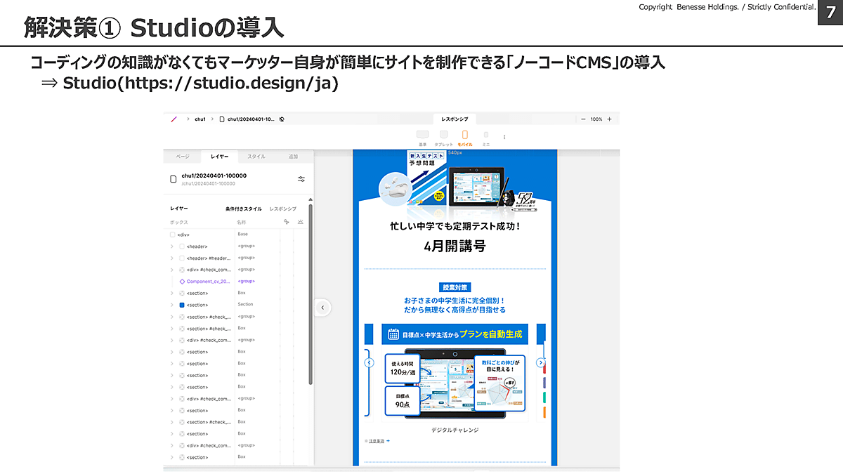 Studioの導入は迅速に進められた。Studio導入の意思決定は2023年8月に行われたが、そこから1か月で制作会社とプロジェクト計画を策定し、10月には中学講座サイトでテスト運用を開始、その後2か月間の結果を見てStudioから、他のサイトにもStudioの導入を広げていったという。