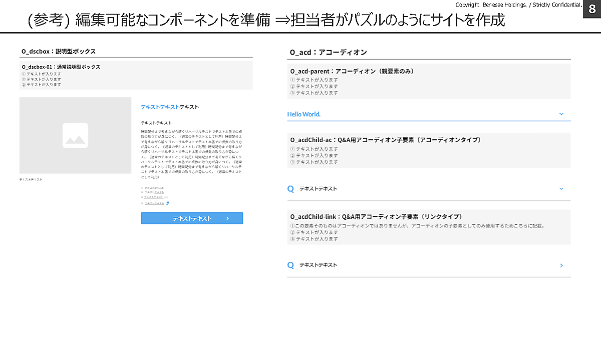 ベネッセの次世代型Webサイト運用プロジェクトでは、デジタルマーケティングに精通したチームが、「説明型ボックス」「Q&A用アコーディオンボックス」など、約200種類ものコンポーネントを作成した。これらのコンポーネントをいわば“レゴブロック”のように組み合わせ、簡単にサイトを構築できるため、コーディング知識を持たない社員でも質の高いページを作成できるというわけだ。