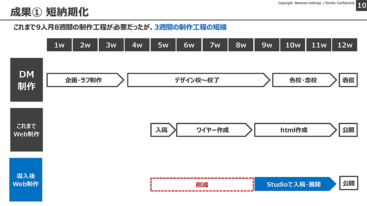 もともとWebの制作工程には8週間ほど必要としていたが、これを3週間短縮できたという。紙のDMを校了してからWebの制作に取り掛かるフローに組みなおすことで、DMに変更が発生したからWebにも反映するという煩雑さをなくすことができた。