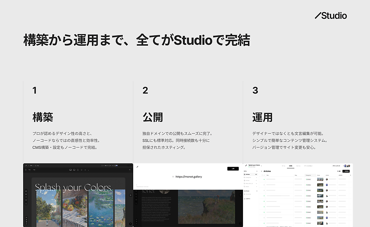 Studioは、ノーコードでありながらテンプレートに縛られず、コーディングと遜色のないWebサイトの制作、運用ができるプラットフォームである。その特長は、構築・公開・運用の3つのステップで説明できる。