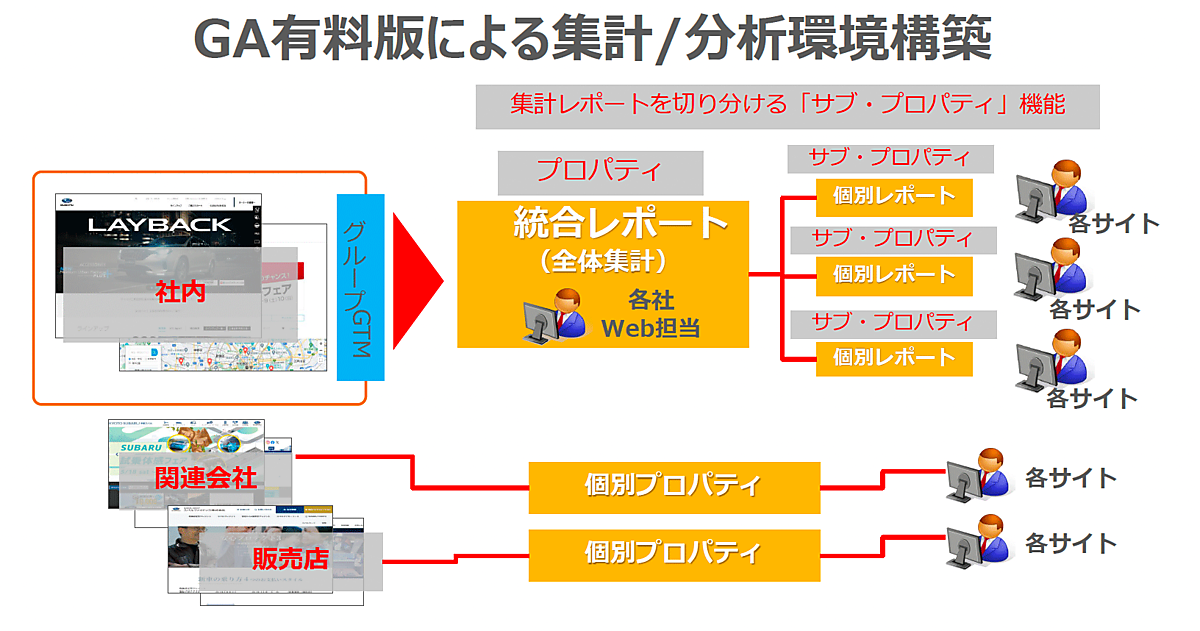 もちろん、部門ごとのサイトは、担当者も制作会社も異なるので、それぞれ必要なサイトのレポートのみにアクセスできるようにする必要がある。そこで、GAの有償版である「GA360」の「サブプロパティ」機能によって権限管理を行った。