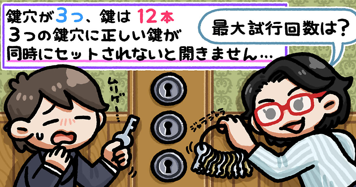 鍵穴が3つ、鍵が12個あります。3つの鍵穴に正しい鍵が同時にセットされないと扉はあきません。最大試行回数は?