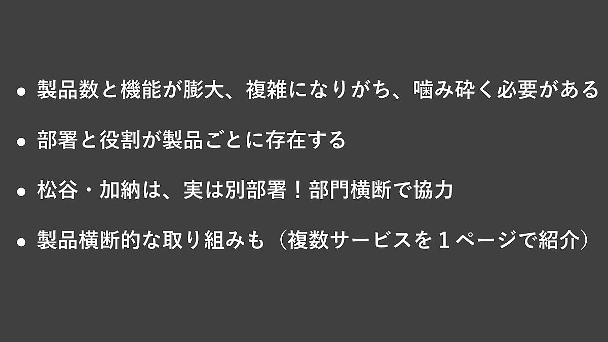 また、異なる製品が、同じことができる機能を持っていることもあるが、そのレベルが異なる場合、比較しつつ簡単に紹介するのは容易ではない。部署と役割が製品ごとに存在するため、詳細な情報を得ながらコンテンツを作成するには、部門横断で協力し合う必要がある。製品横断のプロジェクトを増やすと同時に、製品横断でのコンテンツ作成も進めていった。
