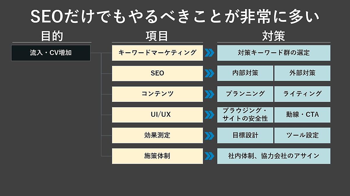 具体的には、まず関係者全員が集まってゼロから議論し、ポストイットなどを用いて大まかなジャーニーマップを作成。それぞれのステップで行われるユーザー行動や検索キーワードを洗い出したのちに、実際に検索して現状を検証した。その後、部門に分かれて、担当部分を実行できる施策へと落とし込んでいったという。