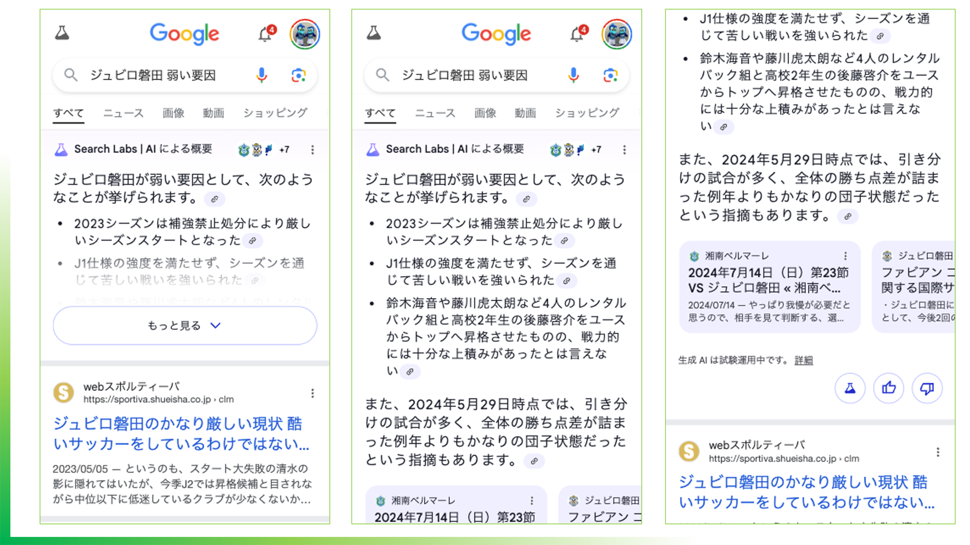 AI Overviewは非常に賢いです。たとえば、自分がひいきにしているサッカーチームのジュビロ磐田がなぜ弱いのかと検索すれば、「補強禁止処分が原因です」といったことまで説明してくれます。ただし情報がちょっと古い印象はあります(木村氏)