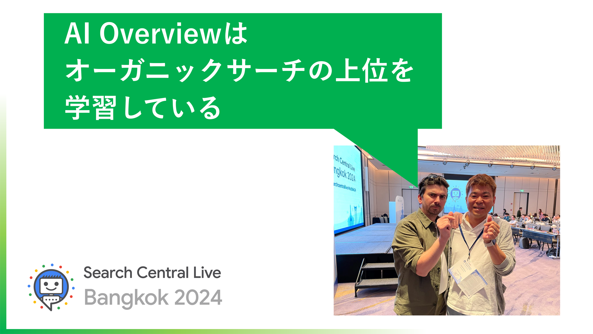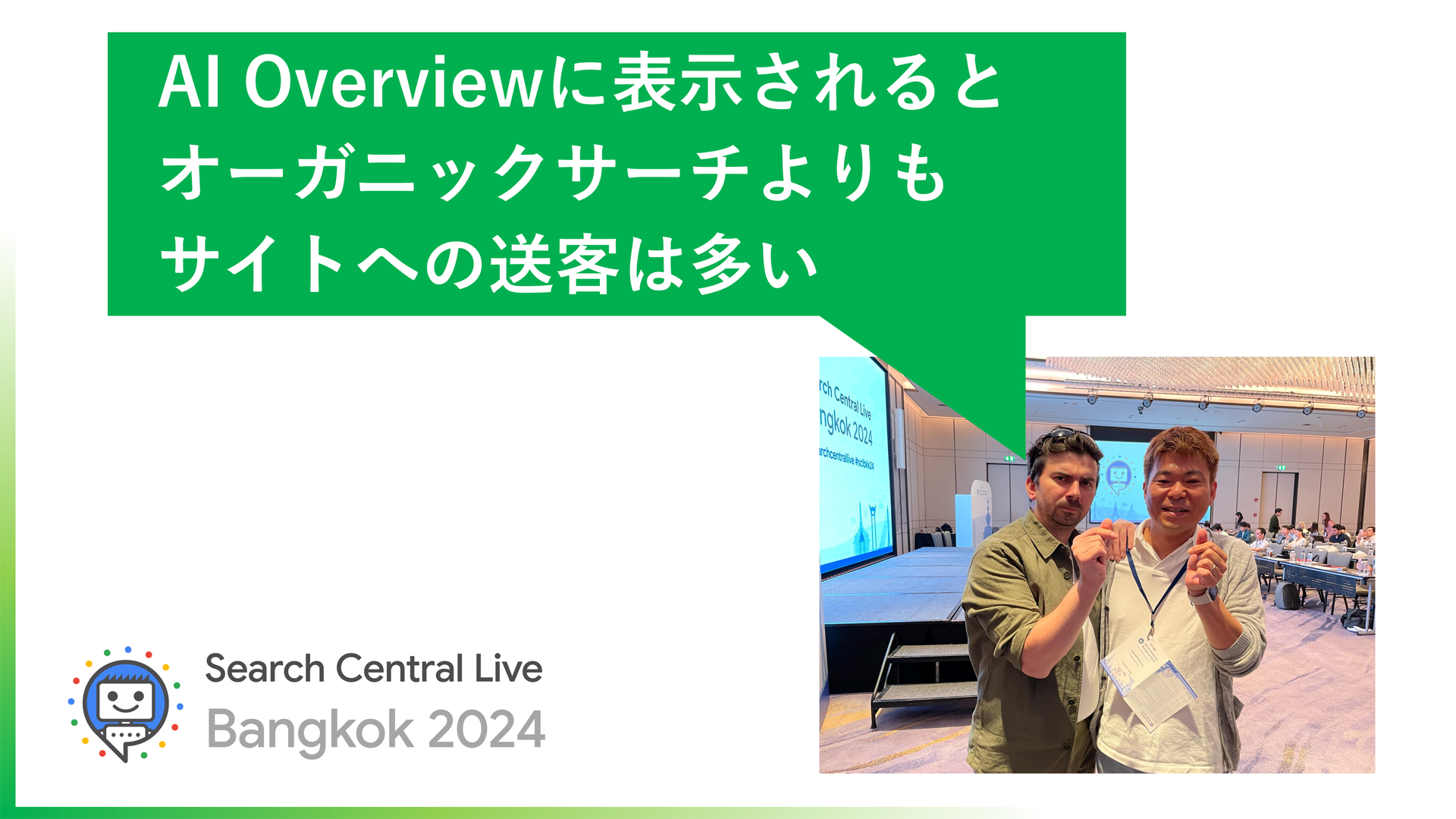 木村氏はこのほど、検索関連の開発者向けイベント「Search Central Live Bangkok 2024」に参加。そこではGoogleの関係者から「AI Overviewに表示されるとオーガニック検索よりもサイトへの送客は多い」「AI Overviewは強調スニペットと似ている」との説明を受けた。
