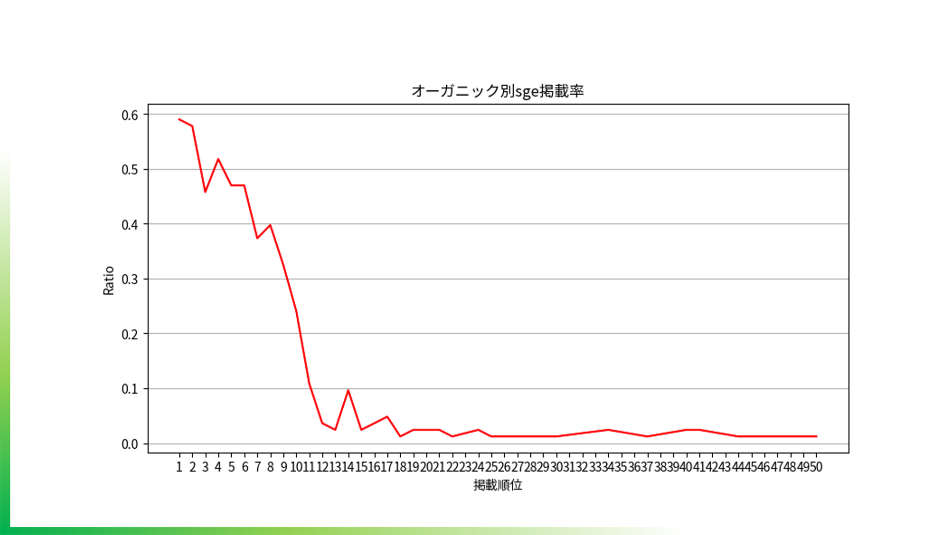 この説明をもとに木村氏らが調べたところ、Googleのオーガニック検索における上位サイトは、AI Overviewのリンク先として参照される確率が高い。特に、上位3位程度までの表示率が高く、逆に10位を下回ると、AI Overviewからはほぼリンクされない。