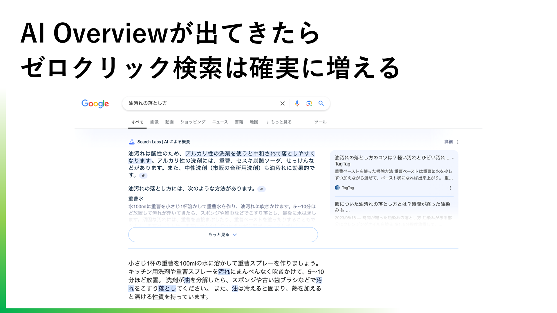 AI Overviewでは、検索者が探している“質問への答え”がGoogle検索画面内でズバリ表示されるので、外部サイトへ遷移する必要性は薄まる。よって木村氏は「ゼロクリック検索は100%増えると思う」と説明する。
