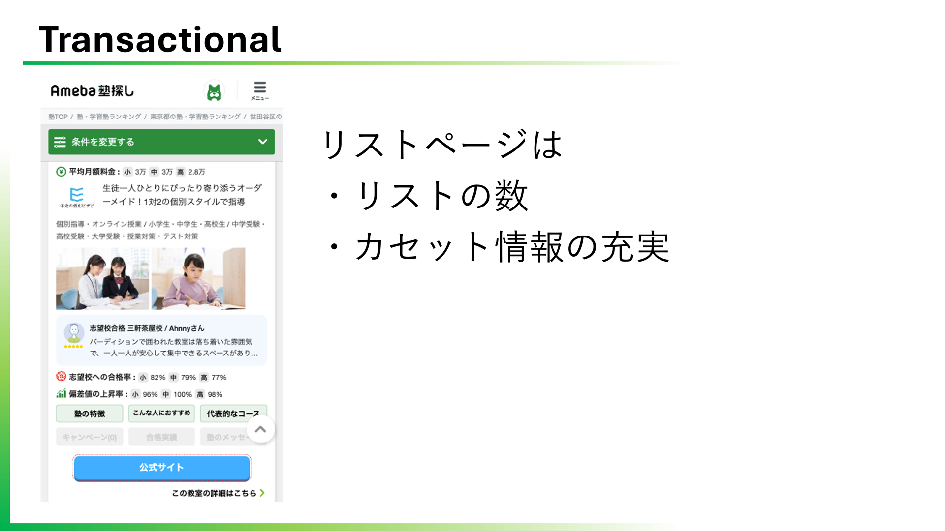 また、Transactionalクエリにおいては、たとえばECサイト・サービス比較サイトにおけるリストページでは、リスト自体の数、そしてカセット情報(基本情報を表・テンプレート風にまとめた掲載枠)の充実は必須条件だ。