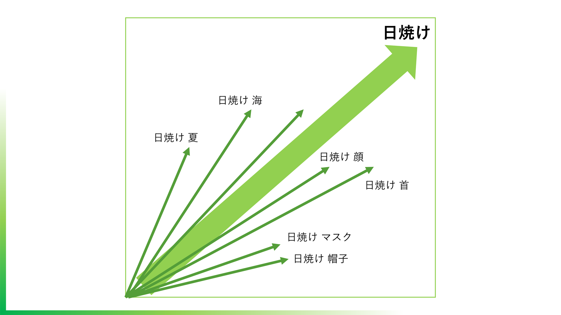 NLP(自然言語処理)やコサイン類似度について詳しい方ならご存じでしょうが、コンテンツにはベクトルを持たせることができます。たとえば日焼けのコンテンツがあったとして、別のところでビジネスの話をしていると、これではベクトルがバラバラ。(SEO的には)ノイズになります。本流のベクトルをどれだけ長くできるか、どうすれば助けになるかを考えるのが大事です(木村氏)