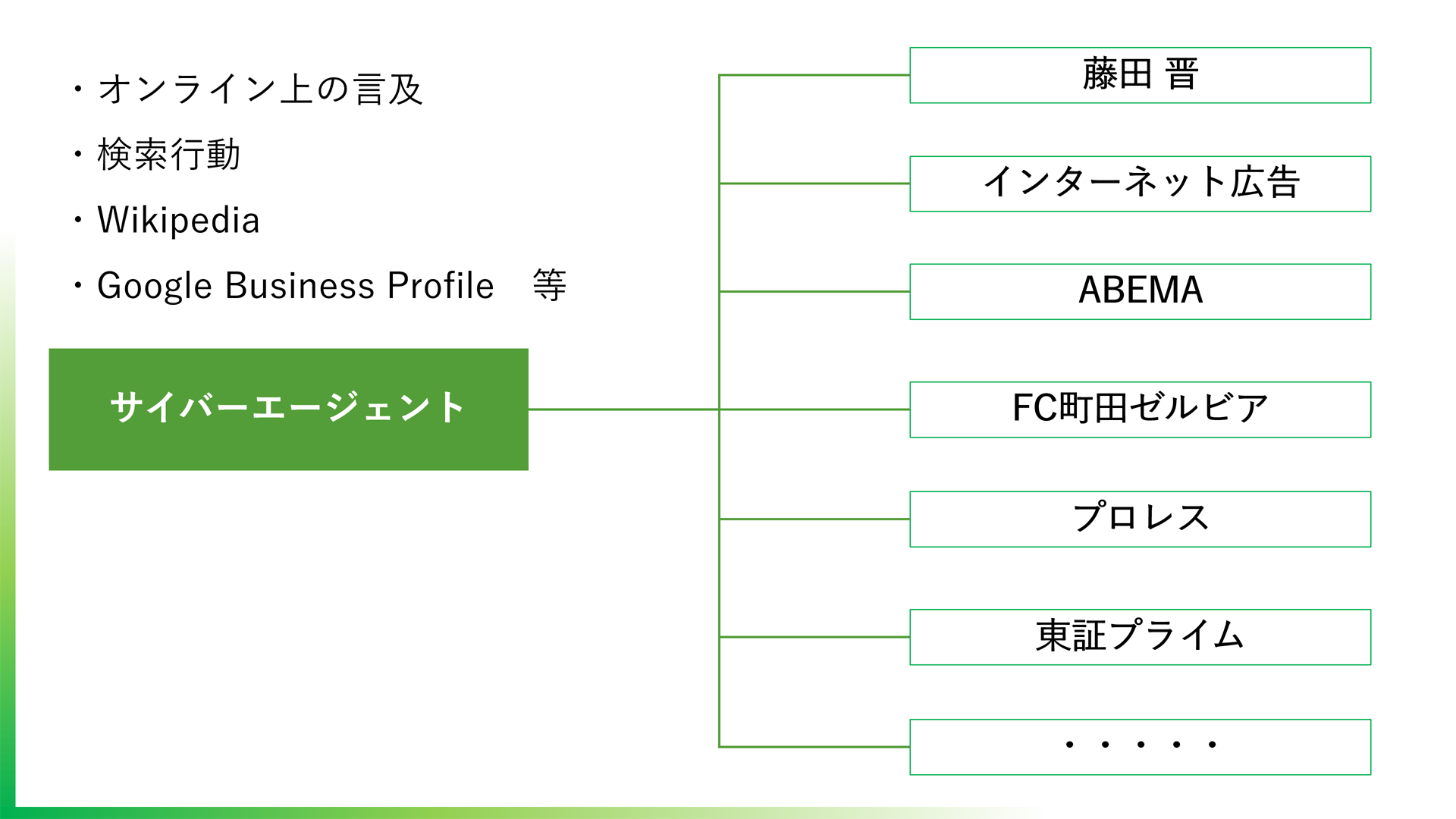 たとえば、サイバーエージェントというトピックに対しては「藤田晋(社長)」「インターネット広告」「ABEMA」などのキーワードを組み合わせて検索する例が多い。この組み合わせで使われるキーワードが“サイテーション”だ。「サイバーエージェント インターネット広告」という検索が数多くなされることによって、Googleは「サイバーエージェントはインターネット広告の会社」と識別していく。