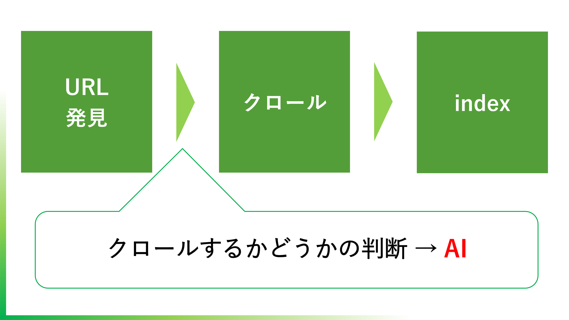 Google検索にサイトやページが表示されるには、URLをGoogleに発見してもらい、ロボットにクロールさせ、インデックスされるという順序を踏む。しかし、Google側にはリソースを節約したいとの思惑があるとみられ、発見したURLをクロールするか、クロールしたサイトをインデックス化するかの判断にAI・機械学習技術を持ち込んでいるとみられる。