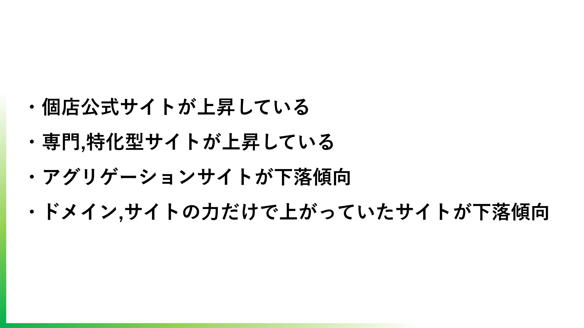 大規模サイト同士の争いだと、より大規模サイトが強い傾向にあります。大規模サイトの争いの中に小規模が散りばめられるような結果になっていて、アグリゲーションサイトは下がったものもあります(木村氏)
