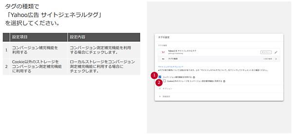 複数のタグを併用したり、サイトが大きかったりする場合はもちろん、基本的にはタグを一括管理できる「GTM(Google Tag Manager)」を活用するとよい。「タグの種類」画面で「Yahoo広告 サイトジェネラルタグ」を検索・選択し、「サイトジェネラルタグについて」のチェックボックス(コンバージョン保管機能を利用する/Cookie以外のストレージをコンバージョン測定保管機能に利用する)に必要に応じてチェックを入れる。これでデータ消失まで24時間から7日間に延長できる。