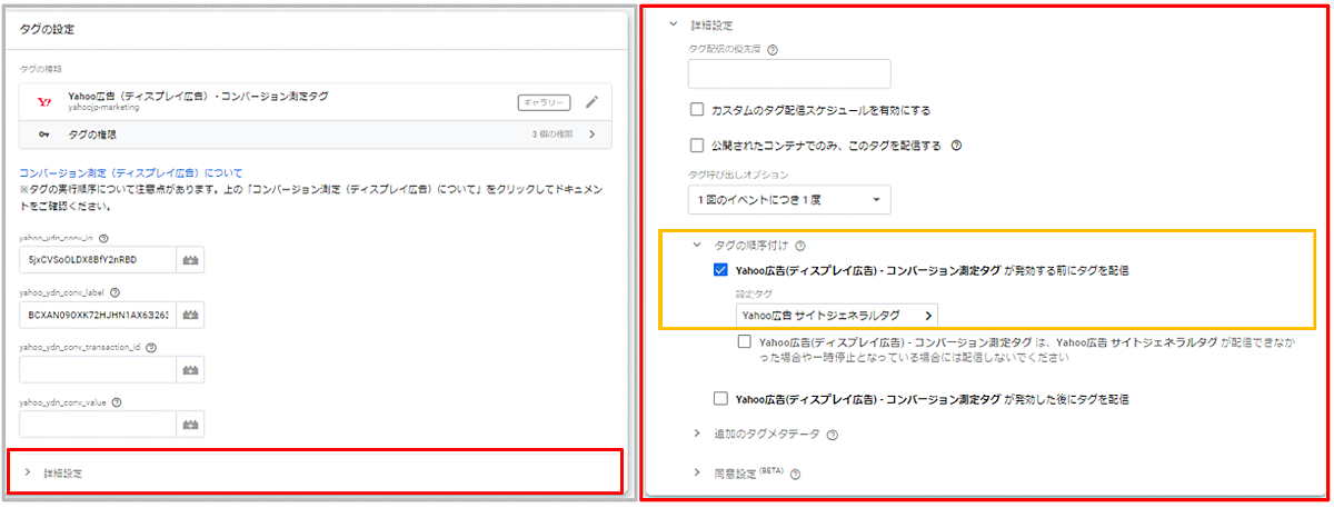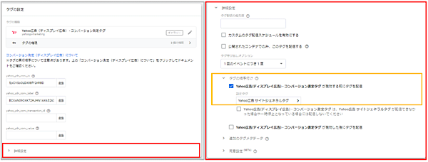 サイトジェネラルタグは、クリック数、CVなどの「各種測定タグ(トラッキングタグ)」の前に読み込まれ、発効される必要があるため、<HEAD>タグ開始直後に設置する。そこで、こちらも「GTM」の「タグの設定」ページの下部にある「詳細設定」で「タグの順序付け」で「Yahoo広告 コンバージョン測定タグが発効する前にタグを配信」をチェックする。