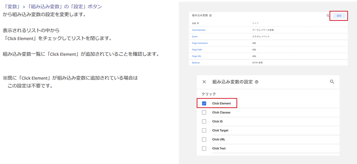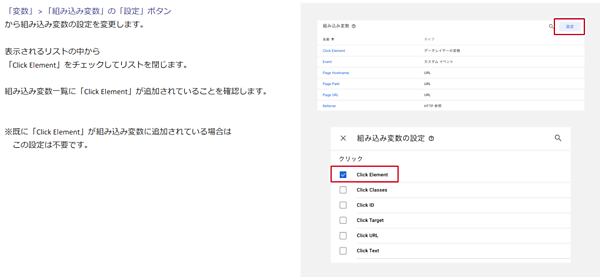 次に、「変数」の「組み込み変数」の設定ボタンから「Click Element」をチェックし、組み込み変数の設定を行う。