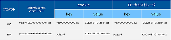YSA(検索広告)とYDA(ディスプレイ広告)でパラメータの付与方法が若干異なる。また、Cookieとローカルストレージで確認する値が異なるので、以下の表を見てチェックしよう。