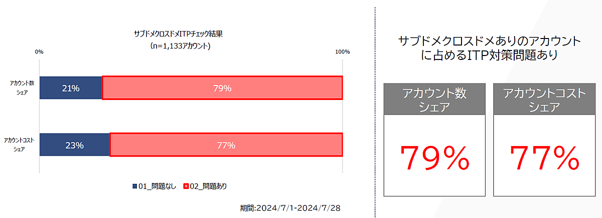 実際にLINEヤフーが、サブドメイン・クロスドメインがある1133アカウントを対象にITP対策が不備なく行えているか調査したところ、なんと8割近くに問題があることが判明したという。