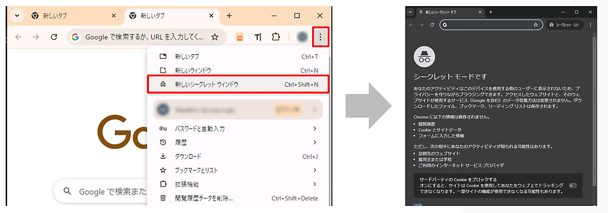 Chromeブラウザでは、3点マークから「新しいシークレットウィンドウ」を選択する。