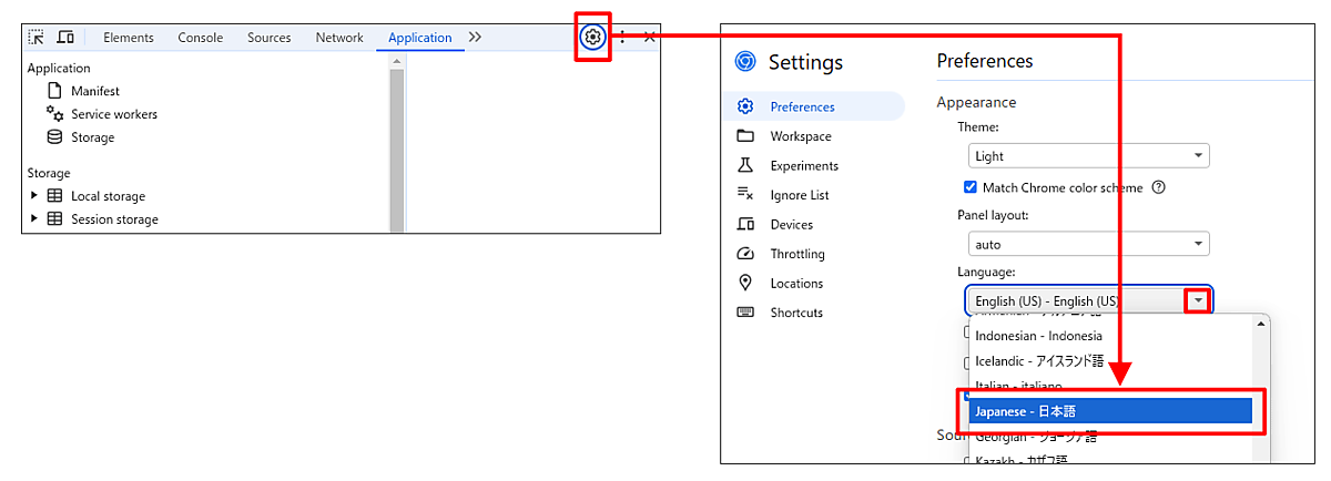 Windowsでは「F12キー」、Macでは「Command + Option + I キー」を押してデベロッパーツールを表示する。設定ボタンを押して、言語を日本語にするとわかりやすい。(英語表示から切り替わらないときは、デベロッパーツールを一度閉じて、開きなおす)