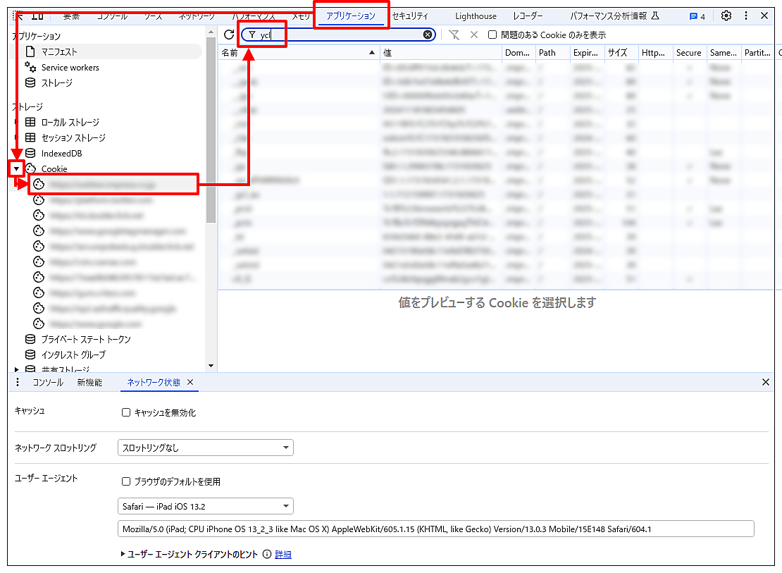 右側にそのサイトのCookieが表示されるので、上部の「フィルタ」に「ycl」と入れると、キーに「ycl」を含むものが表示される。