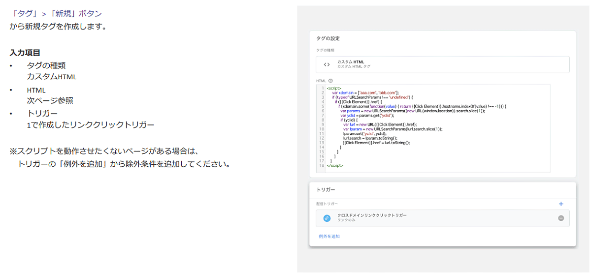 そして、「タグ」の「新規ボタン」から新規タグを作成し、「トリガー」は先に設定した「ワンクリックトリガー」を選定、リンク先とその先が同一であり、データを引き継ぐというように、当該のURL(図ではaaa.comとbbb.com)を修正する。