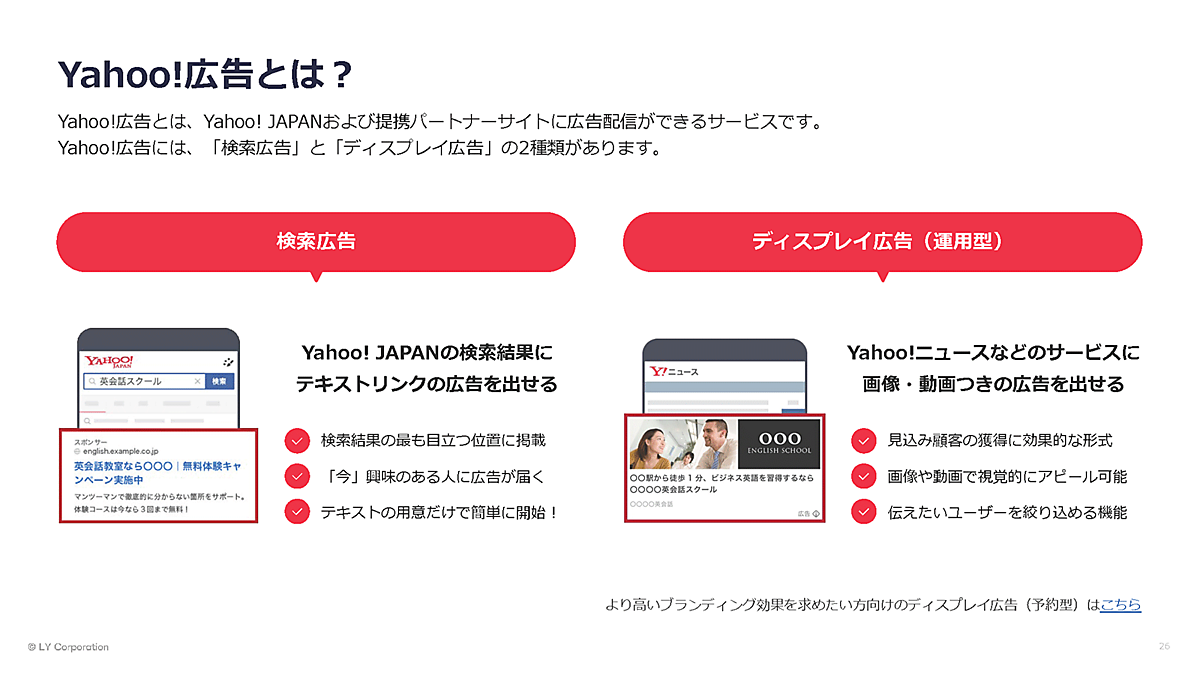 国内最大級のオンライン広告プラットフォームである「Yahoo!広告」。検索広告とディスプレイ広告を展開し、Yahoo! JAPANを中心に多彩なサービス面に露出できるため、老若男女を問わず日本の人口の約8割以上にリーチできる。