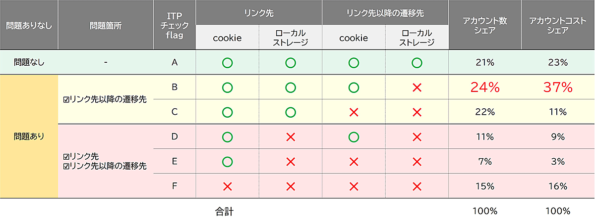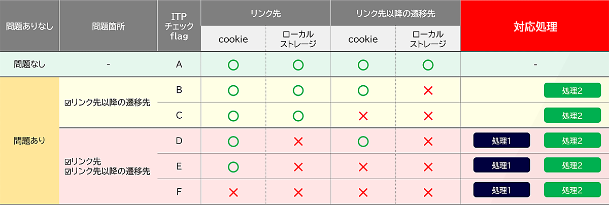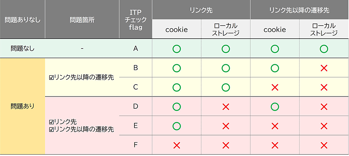 ITP対策に問題があるケースは大きく2種類あり、「Cookie」が欠損するケースと「ローカルストレージ(LS)※」が欠損するケースがある。欠損具合によって、対処方法が、下記図のB~Fの5種類に分類される(Aは欠損がないケース)。B~Fのどれに該当するのかを調べたうえで対応処理を実施していくことになるが、まずはどこにデータの欠損があるのか調べていこう。