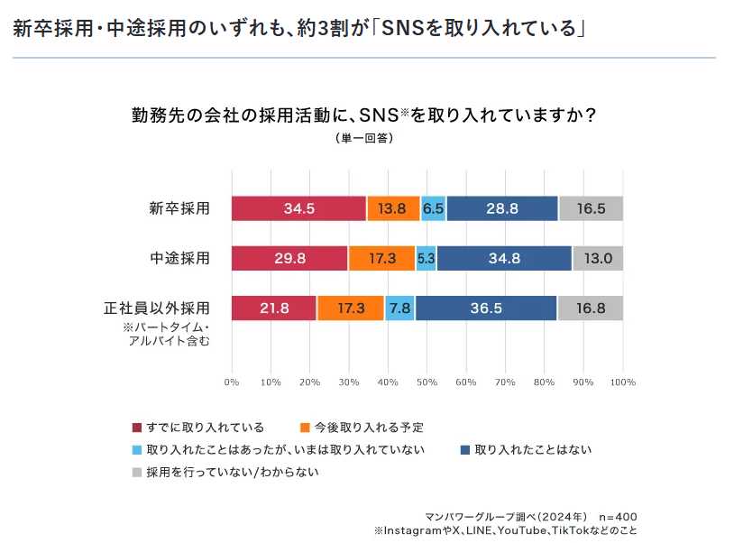 近年、多くの企業が採用活動にSNSを取り入れており、特に「Instagram」がその中心となっています。2024年の調査によると、新卒採用では約34.5%、中途採用では約29.8%の企業がすでにSNSを活用しており、今後はさらに約48%が導入を予定していることがわかっています。