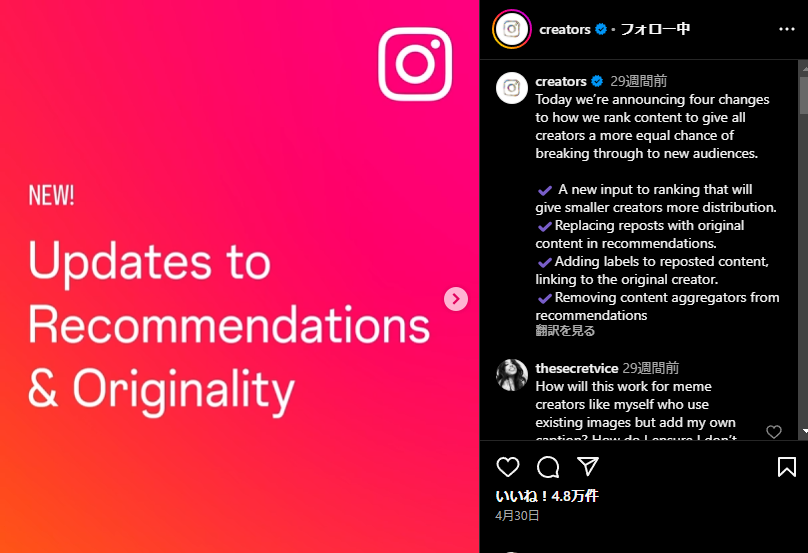 アルゴリズムは、他の投稿を再利用したものよりも、独自性の高いオリジナルコンテンツを優先的に評価します。この変更は、採用活動においても、オリジナル性のあるリールや投稿を重視する必要性を示唆しています。