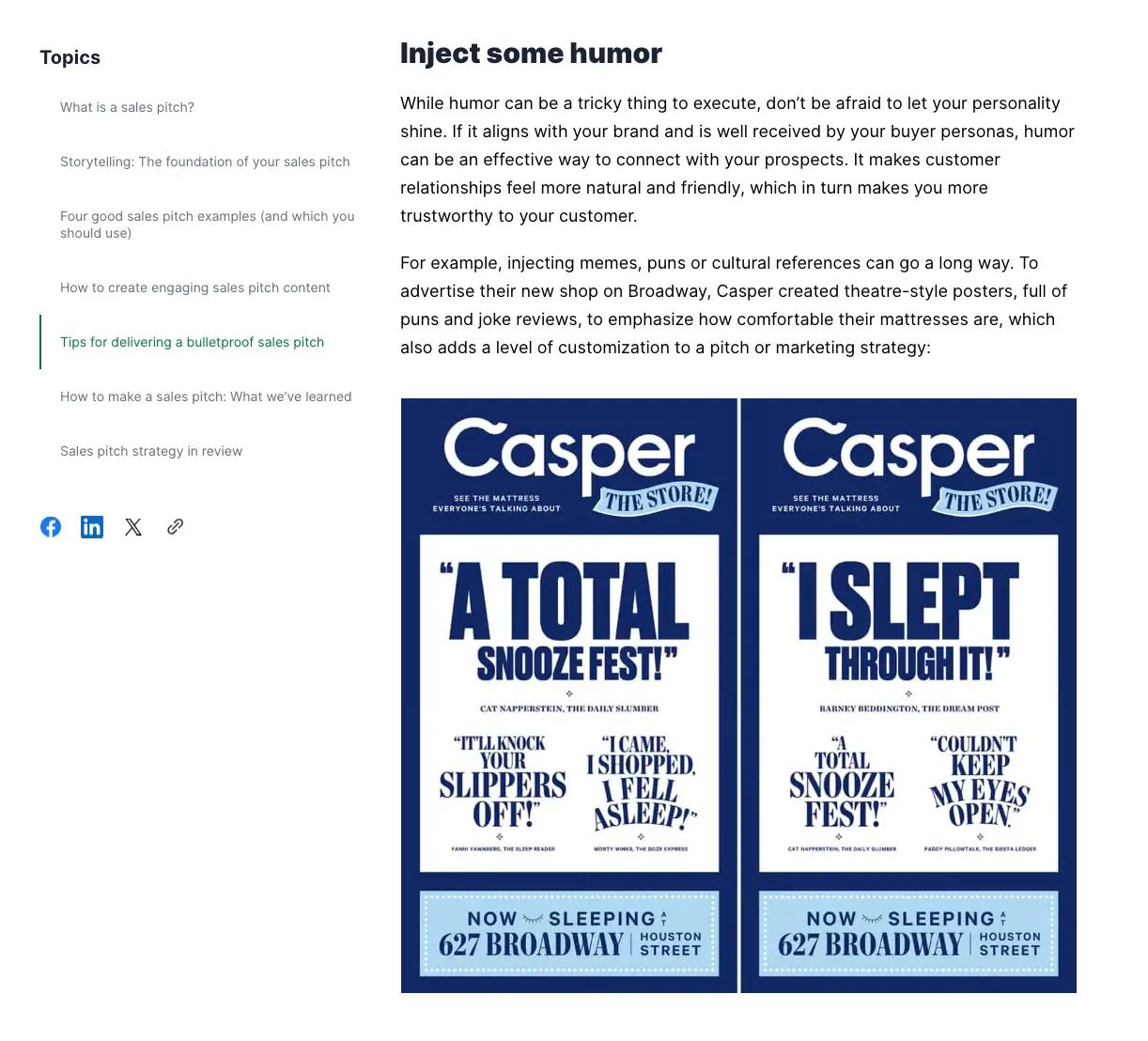 たとえばPipedriveのセールスピッチガイドでは、マットレス会社Casperの事例を紹介している。次のような感じだ: