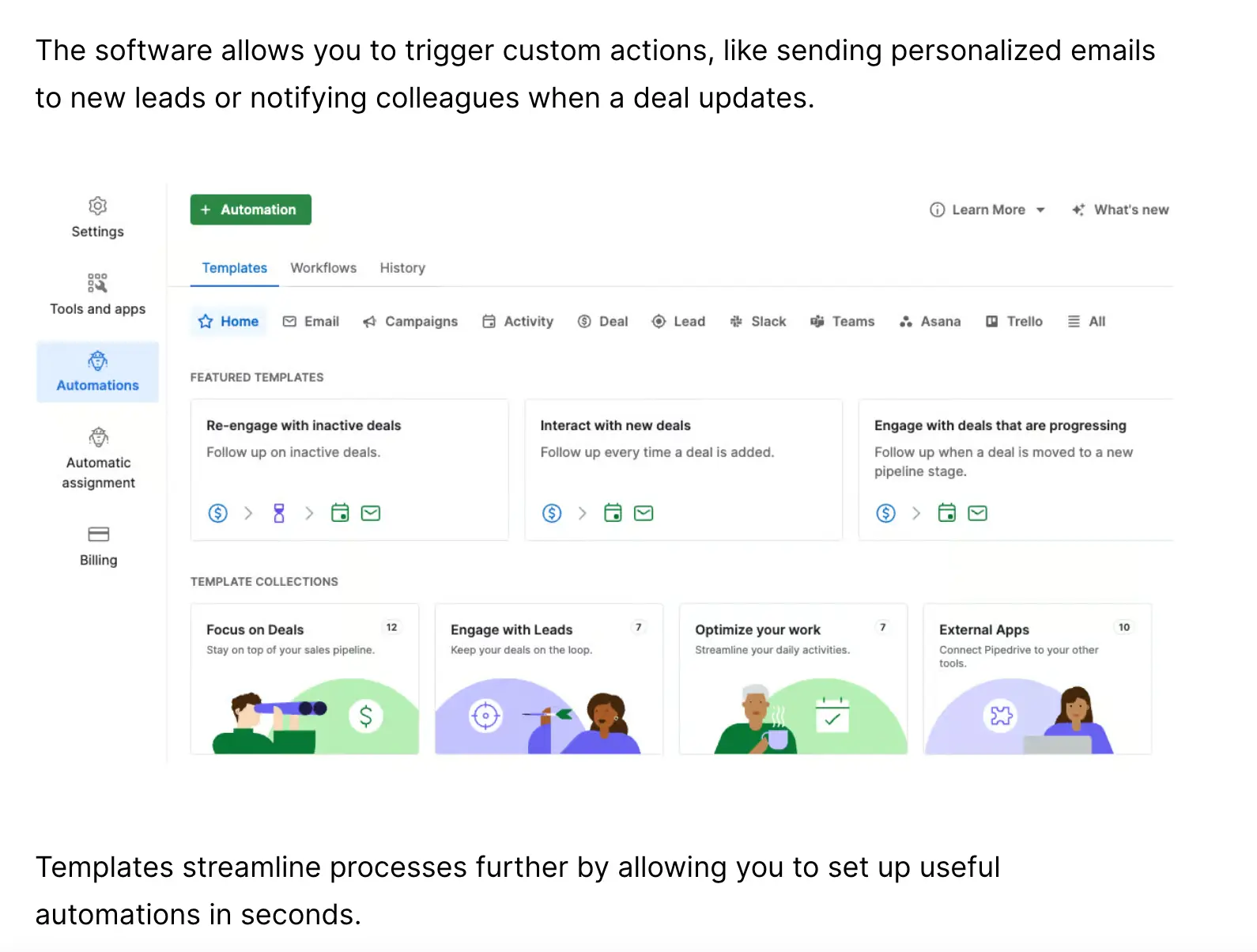 このソフトウェアは、新規見込み客にパーソナライズしたメールを送信したり、取引の更新時に同僚に通知したりするなど、カスタムアクションをトリガーできます。