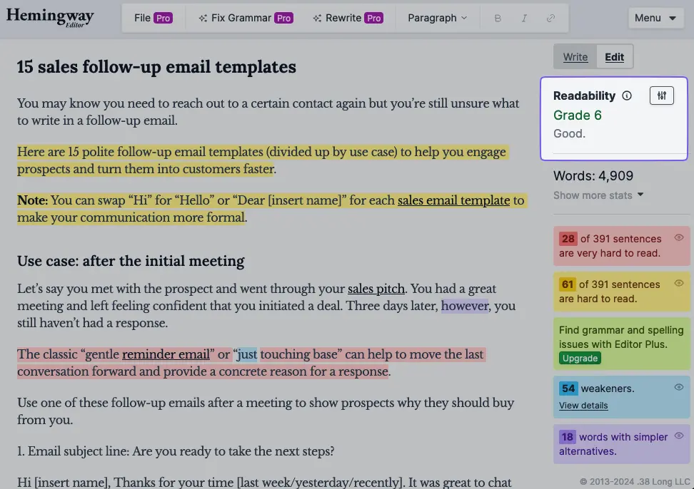 GrammarlyやHemingwayなどのツールは、オーディエンスの読解レベルに合った読みやすさのスコアを維持するのに役立つ。Pipedriveでは、より幅広いオーディエンスに共感してもらえるコンテンツにするために、グレード8~10を目指した。