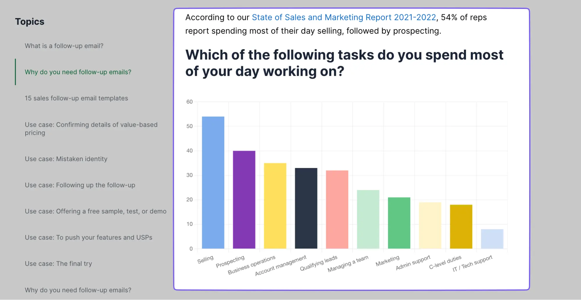 こうした独自データは、もちろんコンテンツから参照し活用している。たとえば、フォローアップメールの書き方とテンプレートを示した記事では、「営業がどんな作業にどれぐらい時間を使っているか」の調査データを示しながら、なぜフォローアップメールが必要かを解説している。